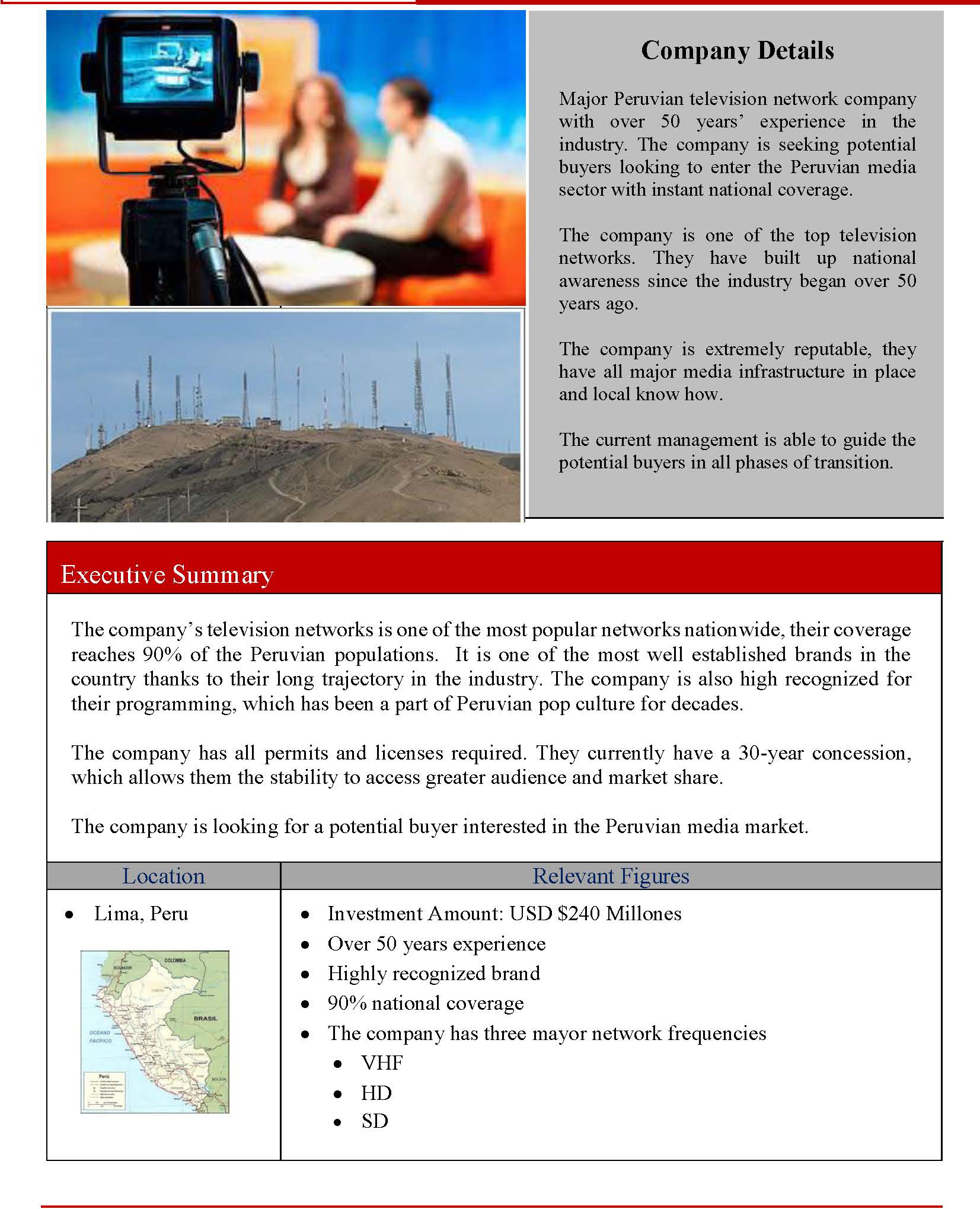 秘鲁一家著名的电视网络公司在电视网络领域已有超过50年的行业经验,现寻找对秘鲁媒体市场感兴趣的潜在收购方。该公司的电视网络覆盖90%的秘鲁人口。公司拥有所有相关的许可证,具有30年的特许经营权,受众和市场份额相当稳定。