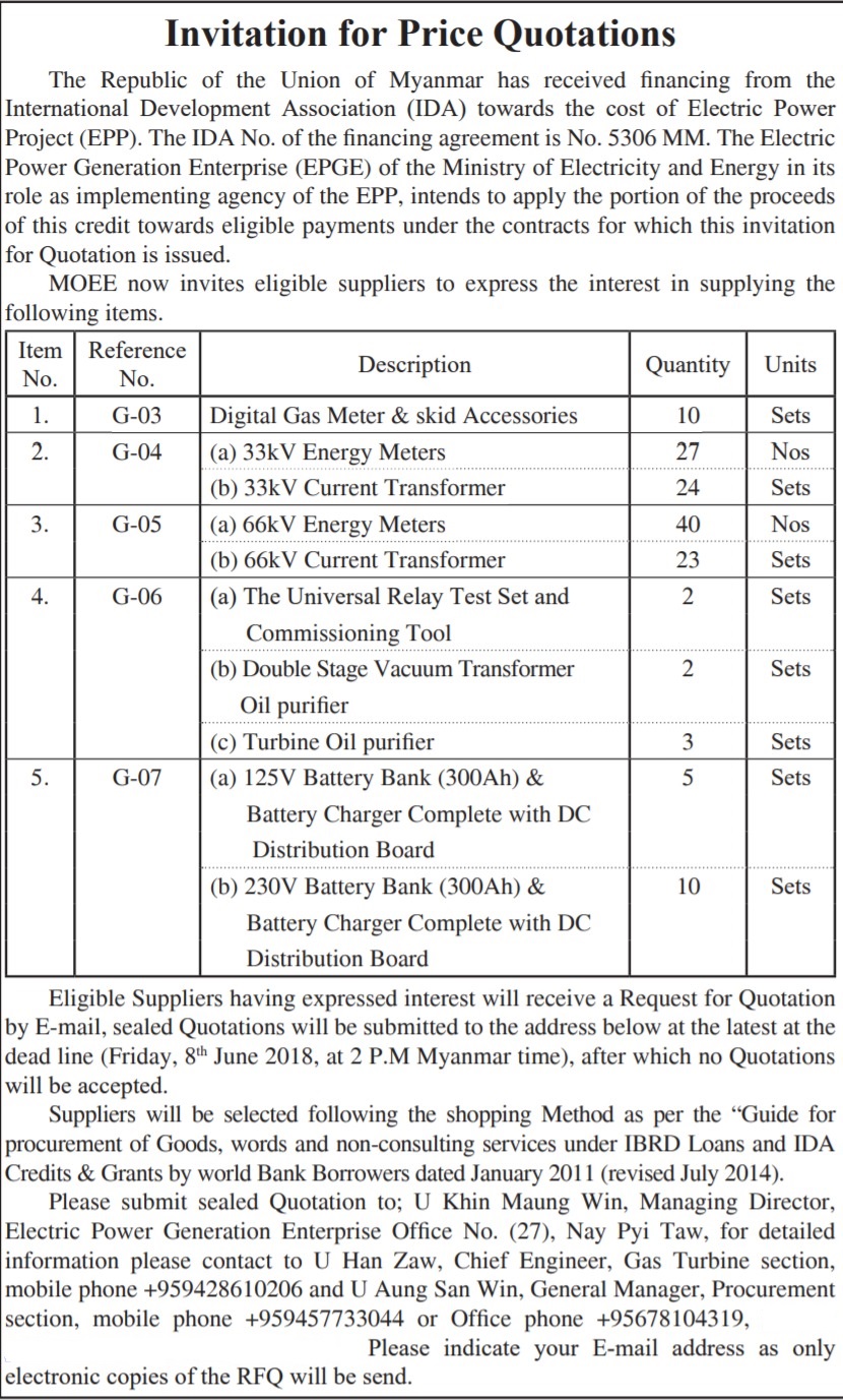 竞标文件)邮寄地址:U Khin Maung Win, Managing Director,Electric Power Generation Enterprise Office No. (27), Nay Pyi Taw