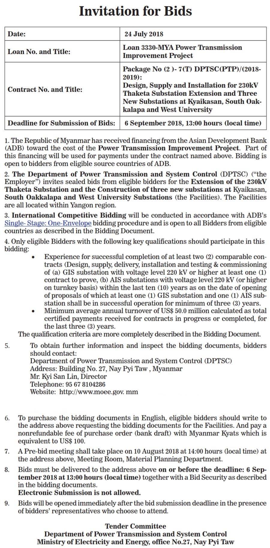 预投标会议:2018年8月10日14:00(当地时间),缅甸电力和能源部物料规划司会议室(Meeting Room, Material Planning Department)。